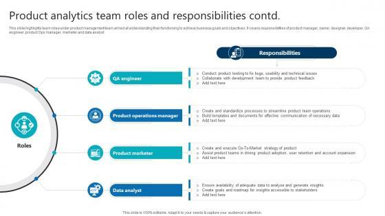 This slide highlights team roles under product management team aimed at understanding their functioning to achieve business goals and objectives. It covers responsibilities of product manager, owner, designer, developer, QA engineer, product Ops manager, marketer and data analyst From laying roadmaps to briefing everything in detail, our templates are perfect for you. You can set the stage with your presentation slides. All you have to do is download these easy-to-edit and customizable templates. Product Analytics Team Roles And Responsibilities Product Analytics Implementation Data Analytics V will help you deliver an outstanding performance that everyone would remember and praise you for. Do download this presentation today. This slide highlights team roles under product management team aimed at understanding their functioning to achieve business goals and objectives. It covers responsibilities of product manager, owner, designer, developer, QA engineer, product Ops manager, marketer and data analyst