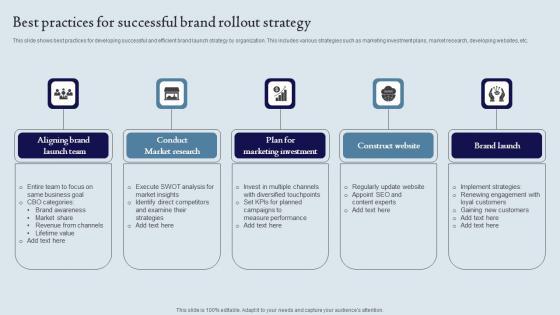 This slide shows best practices for developing successful and efficient brand launch strategy by organization. This includes various strategies such as marketing investment plans, market research, developing websites, etc. Showcasing this set of slides titled Best Practices For Successful Brand Rollout Strategy Ppt Ideas Outline Pdf. The topics addressed in these templates are Conduct Market Research,Construct Website, Brand Lau. All the content presented in this PPT design is completely editable. Download it and make adjustments in color, background, font etc. as per your unique business setting. This slide shows best practices for developing successful and efficient brand launch strategy by organization. This includes various strategies such as marketing investment plans, market research, developing websites, etc.