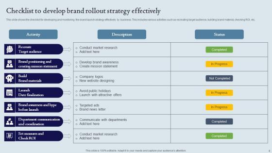 Improve your presentation delivery using this Brand Rollout Strategy Ppt Powerpoint Presentation Complete Deck With Slides. Support your business vision and objectives using this well-structured PPT deck. This template offers a great starting point for delivering beautifully designed presentations on the topic of your choice. Comprising seventeen slides this professionally designed template is all you need to host discussion and meetings with collaborators. Each slide is self-explanatory and equipped with high-quality graphics that can be adjusted to your needs. Therefore, you will face no difficulty in portraying your desired content using this PPT slideshow. This PowerPoint slideshow contains every important element that you need for a great pitch. It is not only editable but also available for immediate download and utilization. The color, font size, background, shapes everything can be modified to create your unique presentation layout. Therefore, download it now. Our Brand Rollout Strategy Ppt Powerpoint Presentation Complete Deck With Slides are topically designed to provide an attractive backdrop to any subject. Use them to look like a presentation pro.