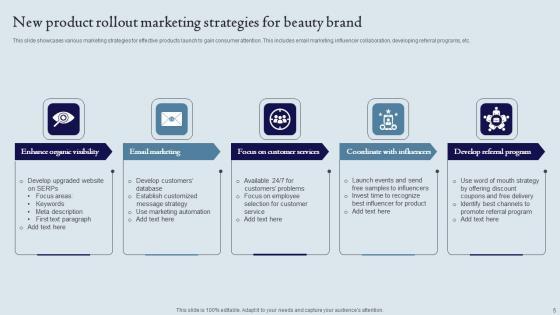 This slide showcases various marketing strategies for effective products launch to gain consumer attention. This includes email marketing, influencer collaboration, developing referral programs, etc. Pitch your topic with ease and precision using this New Product Rollout Marketing Strategies For Beauty Brand Ppt Ideas Pictures Pdf. This layout presents information on Enhance Organic Visibility,Email Marketing, Coordinate With Influencers. It is also available for immediate download and adjustment. So, changes can be made in the color, design, graphics or any other component to create a unique layout. This slide showcases various marketing strategies for effective products launch to gain consumer attention. This includes email marketing, influencer collaboration, developing referral programs, etc.