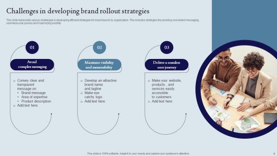This slide represents various challenges in developing efficient strategies for brand launch by organization. This includes strategies like avoiding convoluted messaging, seamless user journey and maximizing visibility. Showcasing this set of slides titled Challenges In Developing Brand Rollout Strategies Ppt Layouts Graphics Template Pdf. The topics addressed in these templates are Avoid Complex Messaging, Maximize Visibility, Deliver Seamless, User Journey. All the content presented in this PPT design is completely editable. Download it and make adjustments in color, background, font etc. as per your unique business setting. This slide represents various challenges in developing efficient strategies for brand launch by organization. This includes strategies like avoiding convoluted messaging, seamless user journey and maximizing visibility.