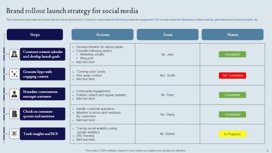 This slide showcases steps and action plan for new product launch by brand on social media for enhancing customer engagement. This includes steps like developing content calendar, generating hype, tracking insights, etc. Pitch your topic with ease and precision using this Brand Rollout Launch Strategy For Social Media Ppt Outline Model Pdf. This layout presents information on Steps, Actions, Team, Status. It is also available for immediate download and adjustment. So, changes can be made in the color, design, graphics or any other component to create a unique layout. This slide showcases steps and action plan for new product launch by brand on social media for enhancing customer engagement. This includes steps like developing content calendar, generating hype, tracking insights, etc.