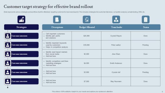 This Slide represents various strategies and workflow chart for effectively targeting customer for new brand launch. This includes strategies like customer interviews, competitor analysis, sample testing, CRM, etc. Showcasing this set of slides titled Customer Target Strategy For Effective Brand Rollout Ppt Styles Professional Pdf. The topics addressed in these templates are Customer Interviews, Competitor Analysis, Sample Testing. All the content presented in this PPT design is completely editable. Download it and make adjustments in color, background, font etc. as per your unique business setting. This Slide represents various strategies and workflow chart for effectively targeting customer for new brand launch. This includes strategies like customer interviews, competitor analysis, sample testing, CRM, etc.