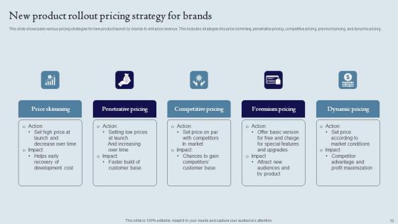 This slide showcases various pricing strategies for new product launch by brands to enhance revenue. This includes strategies like price skimming, penetrative pricing, competitive pricing, premium pricing, and dynamic pricing. Showcasing this set of slides titled New Product Rollout Pricing Strategy For Brands Ppt Pictures Background Pdf. The topics addressed in these templates are Price Skimming, Penetrative Pricing, Competitive Pricing. All the content presented in this PPT design is completely editable. Download it and make adjustments in color, background, font etc. as per your unique business setting. This slide showcases various pricing strategies for new product launch by brands to enhance revenue. This includes strategies like price skimming, penetrative pricing, competitive pricing, premium pricing, and dynamic pricing.