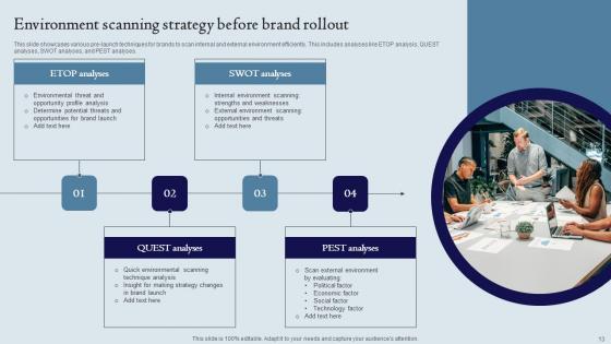 This slide showcases various pre-launch techniques for brands to scan internal and external environment efficiently. This includes analyses like ETOP analysis, QUEST analyses, SWOT analyses, and PEST analyses. Showcasing this set of slides titled Environment Scanning Strategy Before Brand Rollout Ppt Infographic Template Format Ideas Pdf. The topics addressed in these templates are ETOP Analysis, QUEST Analyses, SWOT Analyses. All the content presented in this PPT design is completely editable. Download it and make adjustments in color, background, font etc. as per your unique business setting. This slide showcases various pre-launch techniques for brands to scan internal and external environment efficiently. This includes analyses like ETOP analysis, QUEST analyses, SWOT analyses, and PEST analyses.