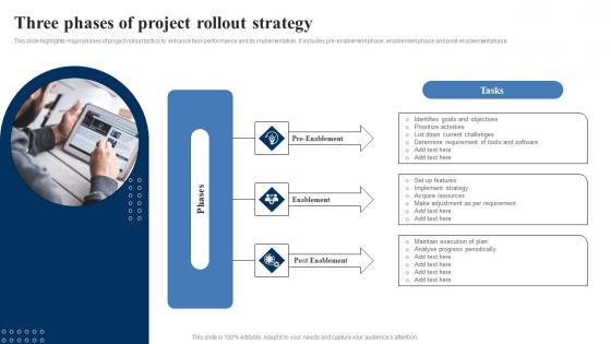 This slide highlights major phases of project rollout tactics to enhance task performance and its implementation. It includes pre enablement phase, enablement phase and post enablement phase.Pitch your topic with ease and precision using this Three Phases Of Project Rollout Strategy Themes Pdf This layout presents information on Implement Strategy, Acquire Resources, Determine Requirement It is also available for immediate download and adjustment. So, changes can be made in the color, design, graphics or any other component to create a unique layout. This slide highlights major phases of project rollout tactics to enhance task performance and its implementation. It includes pre enablement phase, enablement phase and post enablement phase.