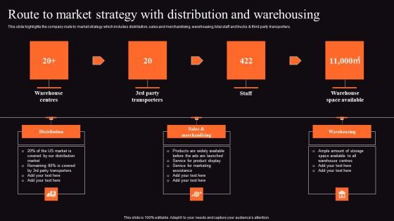 This slide highlights the company route to market strategy which includes distribution, sales and merchandising, warehousing, total staff and trucks and third party transporters. Slidegeeks has constructed Route To Market Strategy With Distribution And Warehousing Themes PDF after conducting extensive research and examination. These presentation templates are constantly being generated and modified based on user preferences and critiques from editors. Here, you will find the most attractive templates for a range of purposes while taking into account ratings and remarks from users regarding the content. This is an excellent jumping off point to explore our content and will give new users an insight into our top notch PowerPoint Templates.