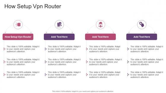 Introducing our well-designed How Setup VPN Router In Powerpoint And Google Slides Cpb. This PowerPoint design presents information on topics like How Setup VPN Router. As it is predesigned it helps boost your confidence level. It also makes you a better presenter because of its high-quality content and graphics. This PPT layout can be downloaded and used in different formats like PDF, PNG, and JPG. Not only this, it is available in both Standard Screen and Widescreen aspect ratios for your convenience. Therefore, click on the download button now to persuade and impress your audience. Our How Setup VPN Router In Powerpoint And Google Slides Cpb are topically designed to provide an attractive backdrop to any subject. Use them to look like a presentation pro.
