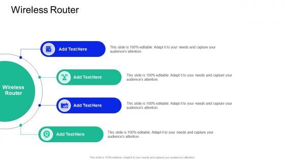 Introducing our well designed Wireless Router In Powerpoint And Google Slides Cpb. This PowerPoint design presents information on topics like Wireless Router. As it is predesigned it helps boost your confidence level. It also makes you a better presenter because of its high quality content and graphics. This PPT layout can be downloaded and used in different formats like PDF, PNG, and JPG. Not only this, it is available in both Standard Screen and Widescreen aspect ratios for your convenience. Therefore, click on the download button now to persuade and impress your audience. Our Wireless Router In Powerpoint And Google Slides Cpb are topically designed to provide an attractive backdrop to any subject. Use them to look like a presentation pro.
