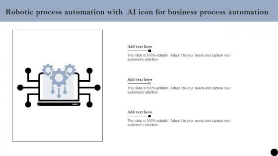 Showcasing this set of slides titled Robotic Process Automation With AI Icon For Business Process Automation Demonstration Pdf. The topics addressed in these templates are Robotic Process Automation, AI Icon, Business Process Automation. All the content presented in this PPT design is completely editable. Download it and make adjustments in color, background, font etc. as per your unique business setting. Our Robotic Process Automation With AI Icon For Business Process Automation Demonstration Pdf are topically designed to provide an attractive backdrop to any subject. Use them to look like a presentation pro.