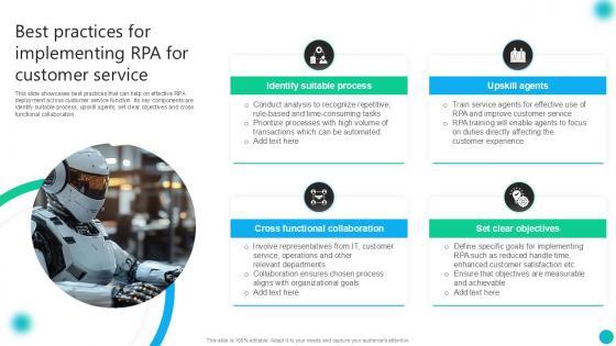 This slide showcases best practices that can help on effective RPA deployment across customer service function. Its key components are identify suitable process, upskill agents, set clear objectives and cross functional collaboration. Present like a pro with Best Practices For Implementing RPA For Customer Service PPT Slide AI SS V. Create beautiful presentations together with your team, using our easy-to-use presentation slides. Share your ideas in real-time and make changes on the fly by downloading our templates. So whether you are in the office, on the go, or in a remote location, you can stay in sync with your team and present your ideas with confidence. With Slidegeeks presentation got a whole lot easier. Grab these presentations today. This slide showcases best practices that can help on effective RPA deployment across customer service function. Its key components are identify suitable process, upskill agents, set clear objectives and cross functional collaboration.