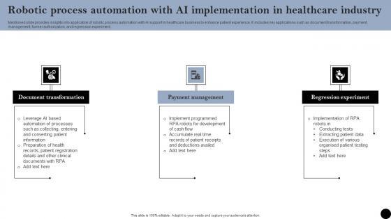 Mentioned slide provides insights into application of robotic process automation with AI support in healthcare business to enhance patient experience. It includes key applications such as document transformation, payment management, former authorization, and regression experiment. Showcasing this set of slides titled Robotic Process Automation With AI Implementation In Healthcare Industry Microsoft Pdf. The topics addressed in these templates are Document Transformation, Payment Management, Former Authorization. All the content presented in this PPT design is completely editable. Download it and make adjustments in color, background, font etc. as per your unique business setting. Mentioned slide provides insights into application of robotic process automation with AI support in healthcare business to enhance patient experience. It includes key applications such as document transformation, payment management, former authorization, and regression experiment.