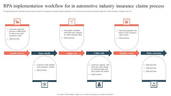 This slide displays the automobile insurance claim process for companies to increase customer satisfaction. It covers the launch process, enter details, trigger bot, collect information, populate coach, etc. Showcasing this set of slides titled RPA Implementation Workflow For In Automotive Industry Insurance Claims Process Introduction Pdf. The topics addressed in these templates are Trigger Bot, Collect Information, Populate Coach. All the content presented in this PPT design is completely editable. Download it and make adjustments in color, background, font etc. as per your unique business setting. This slide displays the automobile insurance claim process for companies to increase customer satisfaction. It covers the launch process, enter details, trigger bot, collect information, populate coach, etc.