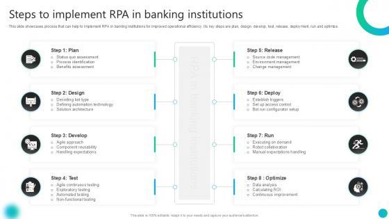 This slide showcases process that can help to implement RPA in banking institutions for improved operational efficiency. Its key steps are plan, design, develop, test, release, deployment, run and optimize. Do you have to make sure that everyone on your team knows about any specific topic I yes, then you should give Steps To Implement RPA In Banking Institutions PPT Example AI SS V a try. Our experts have put a lot of knowledge and effort into creating this impeccable Steps To Implement RPA In Banking Institutions PPT Example AI SS V. You can use this template for your upcoming presentations, as the slides are perfect to represent even the tiniest detail. You can download these templates from the Slidegeeks website and these are easy to edit. So grab these today This slide showcases process that can help to implement RPA in banking institutions for improved operational efficiency. Its key steps are plan, design, develop, test, release, deployment, run and optimize.