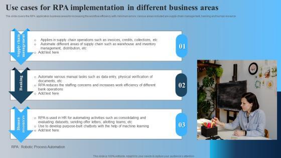 The slide covers the RPA application business areas for increasing the workflow efficiency with minimum errors. Various areas included are supply chain management, banking and human resource Showcasing this set of slides titled Use Cases For RPA Implementation In Different Business Areas Professional Pdf The topics addressed in these templates are Supply Chain Management, Banking, Human Resources All the content presented in this PPT design is completely editable. Download it and make adjustments in color, background, font etc. as per your unique business setting. The slide covers the RPA application business areas for increasing the workflow efficiency with minimum errors. Various areas included are supply chain management, banking and human resource