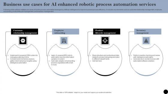 Following slide outlines multiple use cases of robotic process automation leveraged by Artificial intelligence to improve business process efficiency. It includes key elements such as customer relationship management, employee onboarding, product lifecycle management, and inventory management. Pitch your topic with ease and precision using this Business Use Cases For AI Enhanced Robotic Process Automation Services Elements Pdf. This layout presents information on Employee Onboarding, Product Lifecycle Management, Inventory Management. It is also available for immediate download and adjustment. So, changes can be made in the color, design, graphics or any other component to create a unique layout. Following slide outlines multiple use cases of robotic process automation leveraged by Artificial intelligence to improve business process efficiency. It includes key elements such as customer relationship management, employee onboarding, product lifecycle management, and inventory management.
