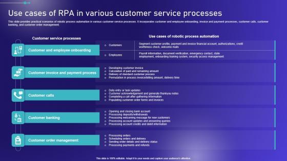 This slide provides practical scenarios of robotic process automation in various customer service processes. It incorporates customer and employee onboarding, invoice and payment processes, customer calls, customer banking, and customer order management. Want to ace your presentation in front of a live audience Our Use Cases Of RPA In Various Customer Service Embracing Robotic Process Slides PDF can help you do that by engaging all the users towards you. Slidegeeks experts have put their efforts and expertise into creating these impeccable powerpoint presentations so that you can communicate your ideas clearly. Moreover, all the templates are customizable, and easy-to-edit and downloadable. Use these for both personal and commercial use. This slide provides practical scenarios of robotic process automation in various customer service processes. It incorporates customer and employee onboarding, invoice and payment processes, customer calls, customer banking, and customer order management.