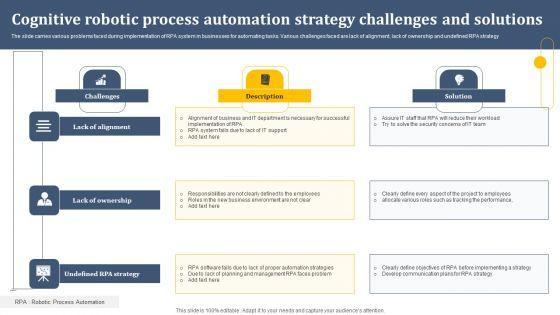The slide carries various problems faced during implementation of RPA system in businesses for automating tasks. Various challenges faced are lack of alignment, lack of ownership and undefined RPA strategy Pitch your topic with ease and precision using this Cognitive Robotic Process Automation Strategy Challenges And Solutions Introduction PDF. This layout presents information on Gather Data, Implement, Repetitive Work. It is also available for immediate download and adjustment. So, changes can be made in the color, design, graphics or any other component to create a unique layout.