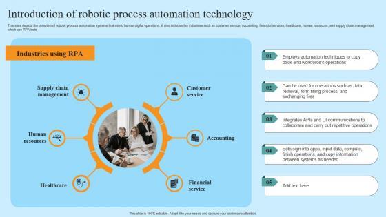 This slide depicts the overview of robotic process automation systems that mimic human digital operations. It also includes the industries such as customer service, accounting, financial services, healthcare, human resources, and supply chain management, which use RPA bots. Are you searching for a Introduction Of Robotic Process Automation Hyper Automation Solutions Graphics Pdf that is uncluttered, straightforward, and original Its easy to edit, and you can change the colors to suit your personal or business branding. For a presentation that expresses how much effort you have put in, this template is ideal With all of its features, including tables, diagrams, statistics, and lists, its perfect for a business plan presentation. Make your ideas more appealing with these professional slides. Download Introduction Of Robotic Process Automation Hyper Automation Solutions Graphics Pdf from Slidegeeks today. This slide depicts the overview of robotic process automation systems that mimic human digital operations. It also includes the industries such as customer service, accounting, financial services, healthcare, human resources, and supply chain management, which use RPA bots.