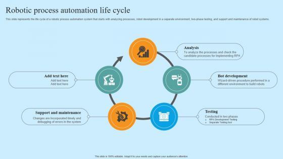 This slide represents the life cycle of a robotic process automation system that starts with analyzing processes, robot development in a separate environment, two-phase testing, and support and maintenance of robot systems. Coming up with a presentation necessitates that the majority of the effort goes into the content and the message you intend to convey. The visuals of a PowerPoint presentation can only be effective if it supplements and supports the story that is being told. Keeping this in mind our experts created Robotic Process Automation Implementation Hyper Automation Solutions Slides Pdf to reduce the time that goes into designing the presentation. This way, you can concentrate on the message while our designers take care of providing you with the right template for the situation. This slide represents the life cycle of a robotic process automation system that starts with analyzing processes, robot development in a separate environment, two-phase testing, and support and maintenance of robot systems.