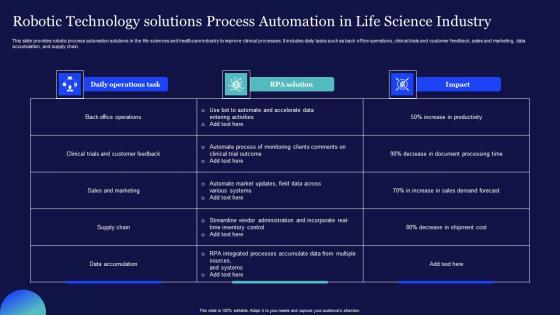 This slide provides robotic process automation solutions in the life sciences and healthcare industry to improve clinical processes. It includes daily tasks such as back office operations, clinical trials and customer feedback, sales and marketing, data accumulation, and supply chain. Pitch your topic with ease and precision using this Robotic Technology Solutions Process Automation In Life Science Industry Pictures Pdf. This layout presents information on Daily Operations Task, Solution, Impact. It is also available for immediate download and adjustment. So, changes can be made in the color, design, graphics or any other component to create a unique layout. This slide provides robotic process automation solutions in the life sciences and healthcare industry to improve clinical processes. It includes daily tasks such as back office operations, clinical trials and customer feedback, sales and marketing, data accumulation, and supply chain.