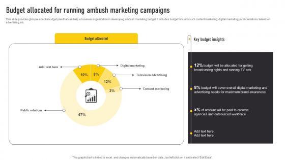 This slide provides glimpse about a budget plan that can help a business organization in developing ambush marketing budget. It includes budget for costs such content marketing, digital marketing, public relations, television advertising, etc. Crafting an eye-catching presentation has never been more straightforward. Let your presentation shine with this tasteful yet straightforward Budget Allocated For Running Ambush Marketing Automate Guerrilla Promotional Brochure Pdf template. It offers a minimalistic and classy look that is great for making a statement. The colors have been employed intelligently to add a bit of playfulness while still remaining professional. Construct the ideal Budget Allocated For Running Ambush Marketing Automate Guerrilla Promotional Brochure Pdf that effortlessly grabs the attention of your audience. Begin now and be certain to wow your customers. This slide provides glimpse about a budget plan that can help a business organization in developing ambush marketing budget. It includes budget for costs such content marketing, digital marketing, public relations, television advertising, etc.