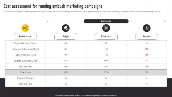 This slide provides glimpse about analyzing annual costs incurred in the ambush marketing. It includes costs such as digital marketing costs, television advertising costs, public relations costs, content marketing costs, etc. Formulating a presentation can take up a lot of effort and time, so the content and message should always be the primary focus. The visuals of the PowerPoint can enhance the presenters message, so our Cost Assessment For Running Ambush Marketing Automate Guerrilla Promotional Sample Pdf was created to help save time. Instead of worrying about the design, the presenter can concentrate on the message while our designers work on creating the ideal templates for whatever situation is needed. Slidegeeks has experts for everything from amazing designs to valuable content, we have put everything into Cost Assessment For Running Ambush Marketing Automate Guerrilla Promotional Sample Pdf This slide provides glimpse about analyzing annual costs incurred in the ambush marketing. It includes costs such as digital marketing costs, television advertising costs, public relations costs, content marketing costs, etc.