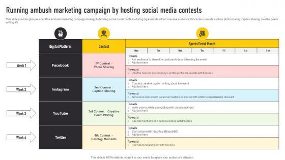 This slide provides glimpse about the ambush marketing campaign strategy by hosting social media contests during big events to attract massive audience. It includes contests such as photo sharing, caption sharing, creative poem writing, etc. Find a pre-designed and impeccable Running Ambush Marketing Campaign By Hosting Automate Guerrilla Promotional Brochure Pdf The templates can ace your presentation without additional effort. You can download these easy-to-edit presentation templates to make your presentation stand out from others. So, what are you waiting for Download the template from Slidegeeks today and give a unique touch to your presentation. This slide provides glimpse about the ambush marketing campaign strategy by hosting social media contests during big events to attract massive audience. It includes contests such as photo sharing, caption sharing, creative poem writing, etc.