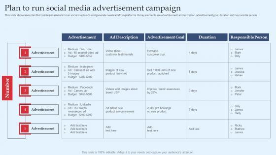 This slide showcases plan that can help marketers to run social media ads and generate new leads from platforms. Its key elements are advertisement, ad description, advertisement goal, duration and responsible person. Formulating a presentation can take up a lot of effort and time, so the content and message should always be the primary focus. The visuals of the PowerPoint can enhance the presenters message, so our Plan To Run Social Media Advertisement Campaign Mockup PDF was created to help save time. Instead of worrying about the design, the presenter can concentrate on the message while our designers work on creating the ideal templates for whatever situation is needed. Slidegeeks has experts for everything from amazing designs to valuable content, we have put everything into Plan To Run Social Media Advertisement Campaign Mockup PDF