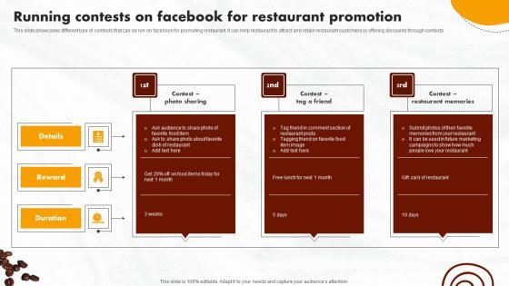 This slide showcases different type of contests that can be run on Facebook for promoting restaurant. It can help restaurant to attract and retain restaurant customers by offering discounts through contests Find a pre-designed and impeccableCoffeehouse Promotion Techniques To Boost Revenue Running Contests On Facebook Restaurant Structure PDF. The templates can ace your presentation without additional effort. You can download these easy-to-edit presentation templates to make your presentation stand out from others. So, what are you waiting for Download the template from Slidegeeks today and give a unique touch to your presentation.