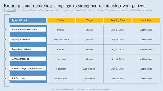 The following slide showcases a comprehensive email marketing campaign which can be used to build strong patient relationship. Information covered in this slide is related to types of email, status, target users, sending date and headline. Create an editable Running Email Marketing Campaign To Strengthen General Management Ideas Pdf that communicates your idea and engages your audience. Whether you are presenting a business or an educational presentation, pre-designed presentation templates help save time. Running Email Marketing Campaign To Strengthen General Management Ideas Pdf is highly customizable and very easy to edit, covering many different styles from creative to business presentations. Slidegeeks has creative team members who have crafted amazing templates. So, go and get them without any delay. The following slide showcases a comprehensive email marketing campaign which can be used to build strong patient relationship. Information covered in this slide is related to types of email, status, target users, sending date and headline.