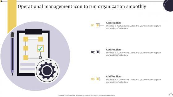 Pitch your topic with ease and precision using this Operational Management Icon To Run Organization Smoothly Demonstration Pdf. This layout presents information on Operational Management Icon, Run Organization Smoothly. It is also available for immediate download and adjustment. So, changes can be made in the color, design, graphics or any other component to create a unique layout. Our Operational Management Icon To Run Organization Smoothly Demonstration Pdf are topically designed to provide an attractive backdrop to any subject. Use them to look like a presentation pro.