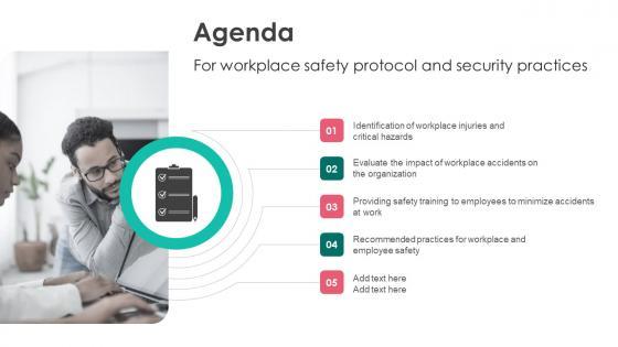Slidegeeks is here to make your presentations a breeze with Agenda For Workplace Safety Protocol And Security Practices Information Pdf With our easy to use and customizable templates, you can focus on delivering your ideas rather than worrying about formatting. With a variety of designs to choose from, you are sure to find one that suits your needs. And with animations and unique photos, illustrations, and fonts, you can make your presentation pop. So whether you are giving a sales pitch or presenting to the board, make sure to check out Slidegeeks first Our Agenda For Workplace Safety Protocol And Security Practices Information Pdf are topically designed to provide an attractive backdrop to any subject. Use them to look like a presentation pro.