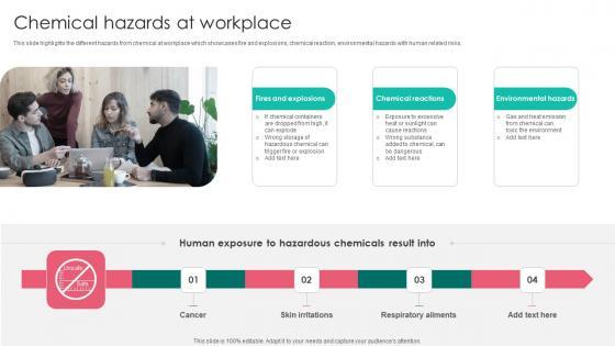 This slide highlights the different hazards from chemical at workplace which showcases fire and explosions, chemical reaction, environmental hazards with human related risks. Do you have an important presentation coming up Are you looking for something that will make your presentation stand out from the rest Look no further than Chemical Hazards Workplace Safety Protocol And Security Practices Themes Pdf. With our professional designs, you can trust that your presentation will pop and make delivering it a smooth process. And with Slidegeeks, you can trust that your presentation will be unique and memorable. So why wait Grab Chemical Hazards Workplace Safety Protocol And Security Practices Themes Pdf today and make your presentation stand out from the rest This slide highlights the different hazards from chemical at workplace which showcases fire and explosions, chemical reaction, environmental hazards with human related risks.