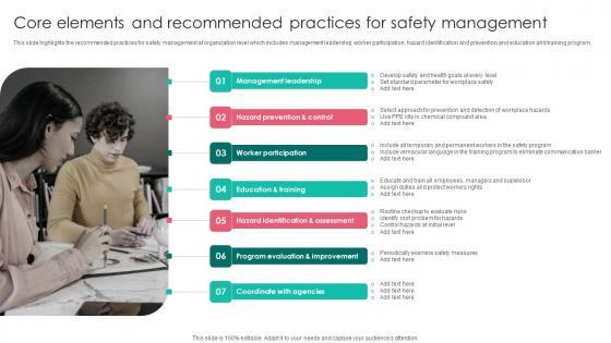 This slide highlights the recommended practices for safety management at organization level which includes management leadership, worker participation, hazard identification and prevention and education and training program. Are you in need of a template that can accommodate all of your creative concepts This one is crafted professionally and can be altered to fit any style. Use it with Google Slides or PowerPoint. Include striking photographs, symbols, depictions, and other visuals. Fill, move around, or remove text boxes as desired. Test out color palettes and font mixtures. Edit and save your work, or work with colleagues. Download Core Elements And Recommended Workplace Safety Protocol And Security Practices Download Pdf and observe how to make your presentation outstanding. Give an impeccable presentation to your group and make your presentation unforgettable. This slide highlights the recommended practices for safety management at organization level which includes management leadership, worker participation, hazard identification and prevention and education and training program.