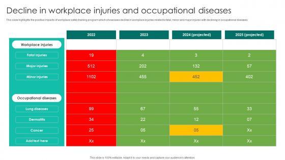 This slide highlights the positive impacts of workplace safety training program which showcases decline in workplace injuries related to fatal, minor and major injures with declining in occupational diseases. Crafting an eye catching presentation has never been more straightforward. Let your presentation shine with this tasteful yet straightforward Decline In Workplace Injuries Workplace Safety Protocol And Security Practices Diagrams Pdf template. It offers a minimalistic and classy look that is great for making a statement. The colors have been employed intelligently to add a bit of playfulness while still remaining professional. Construct the ideal Decline In Workplace Injuries Workplace Safety Protocol And Security Practices Diagrams Pdf that effortlessly grabs the attention of your audience Begin now and be certain to wow your customers This slide highlights the positive impacts of workplace safety training program which showcases decline in workplace injuries related to fatal, minor and major injures with declining in occupational diseases.