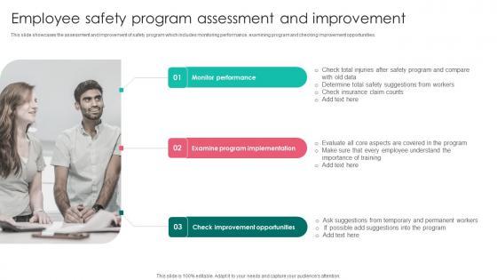 This slide showcases the assessment and improvement of safety program which includes monitoring performance, examining program and checking improvement opportunities. Formulating a presentation can take up a lot of effort and time, so the content and message should always be the primary focus. The visuals of the PowerPoint can enhance the presenters message, so our Employee Safety Program Workplace Safety Protocol And Security Practices Brochure Pdf was created to help save time. Instead of worrying about the design, the presenter can concentrate on the message while our designers work on creating the ideal templates for whatever situation is needed. Slidegeeks has experts for everything from amazing designs to valuable content, we have put everything into Employee Safety Program Workplace Safety Protocol And Security Practices Brochure Pdf This slide showcases the assessment and improvement of safety program which includes monitoring performance, examining program and checking improvement opportunities.