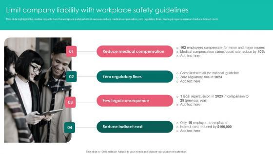 This slide highlights the positive impacts from the workplace safety which showcases reduce medical compensation, zero regulatory fines, few legal repercussion and reduce indirect costs. Explore a selection of the finest Limit Company Liability Workplace Safety Protocol And Security Practices Demonstration Pdf here. With a plethora of professionally designed and pre made slide templates, you can quickly and easily find the right one for your upcoming presentation. You can use our Limit Company Liability Workplace Safety Protocol And Security Practices Demonstration Pdf to effectively convey your message to a wider audience. Slidegeeks has done a lot of research before preparing these presentation templates. The content can be personalized and the slides are highly editable. Grab templates today from Slidegeeks. This slide highlights the positive impacts from the workplace safety which showcases reduce medical compensation, zero regulatory fines, few legal repercussion and reduce indirect costs.