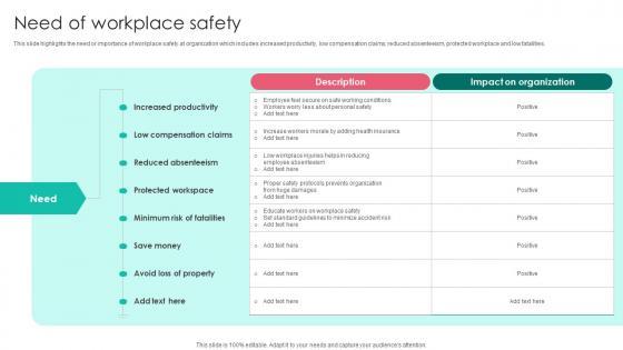 This slide highlights the need or importance of workplace safety at organization which includes increased productivity, low compensation claims, reduced absenteeism, protected workplace and low fatalities. Retrieve professionally designed Need Of Workplace Safety Workplace Safety Protocol And Security Practices Template Pdf to effectively convey your message and captivate your listeners. Save time by selecting pre made slideshows that are appropriate for various topics, from business to educational purposes. These themes come in many different styles, from creative to corporate, and all of them are easily adjustable and can be edited quickly. Access them as PowerPoint templates or as Google Slides themes. You do not have to go on a hunt for the perfect presentation because Slidegeeks got you covered from everywhere. This slide highlights the need or importance of workplace safety at organization which includes increased productivity, low compensation claims, reduced absenteeism, protected workplace and low fatalities.