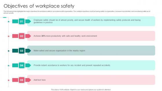 The following slide highlights the major objectives for workplace safety in accordance with organization. The multiple objectives could be having safety in organization, increase in productivity and considering safety as of utmost priority. Slidegeeks has constructed Objectives Of Workplace Safety Workplace Safety Protocol And Security Practices Ideas Pdf after conducting extensive research and examination. These presentation templates are constantly being generated and modified based on user preferences and critiques from editors. Here, you will find the most attractive templates for a range of purposes while taking into account ratings and remarks from users regarding the content. This is an excellent jumping off point to explore our content and will give new users an insight into our top notch PowerPoint Templates. The following slide highlights the major objectives for workplace safety in accordance with organization. The multiple objectives could be having safety in organization, increase in productivity and considering safety as of utmost priority.