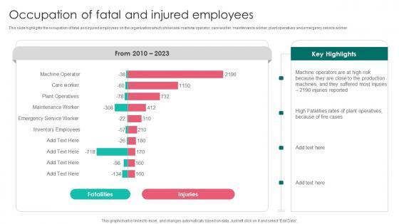 This slide highlights the occupation of fatal and injured employees on the organization which showcase machine operator, care worker, maintenance worker, plant operatives and emergency service worker. Presenting this PowerPoint presentation, titled Occupation Of Fatal And Injured Workplace Safety Protocol And Security Practices Inspiration Pdf, with topics curated by our researchers after extensive research. This editable presentation is available for immediate download and provides attractive features when used. Download now and captivate your audience. Presenting this Occupation Of Fatal And Injured Workplace Safety Protocol And Security Practices Inspiration Pdf. Our researchers have carefully researched and created these slides with all aspects taken into consideration. This is a completely customizable Occupation Of Fatal And Injured Workplace Safety Protocol And Security Practices Inspiration Pdf that is available for immediate downloading. Download now and make an impact on your audience. Highlight the attractive features available with our PPTs. This slide highlights the occupation of fatal and injured employees on the organization which showcase machine operator, care worker, maintenance worker, plant operatives and emergency service worker.