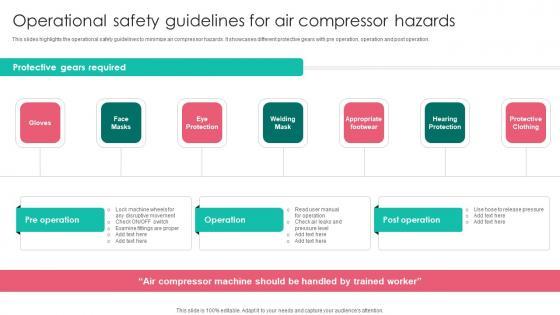 This slides highlights the operational safety guidelines to minimize air compressor hazards. It showcases different protective gears with pre operation, operation and post operation. Here you can discover an assortment of the finest PowerPoint and Google Slides templates. With these templates, you can create presentations for a variety of purposes while simultaneously providing your audience with an eye catching visual experience. Download Operational Safety Guidelines Air Workplace Safety Protocol And Security Practices Icons Pdf to deliver an impeccable presentation. These templates will make your job of preparing presentations much quicker, yet still, maintain a high level of quality. Slidegeeks has experienced researchers who prepare these templates and write high quality content for you. Later on, you can personalize the content by editing the Operational Safety Guidelines Air Workplace Safety Protocol And Security Practices Icons Pdf. This slides highlights the operational safety guidelines to minimize air compressor hazards. It showcases different protective gears with pre operation, operation and post operation.