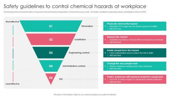 The following slide showcases the steps or measures for chemical hazards at organization. It showcase five ways to deal elimination, substitution, engineering controls, administrative controls and PPE.Find a pre designed and impeccable Safety Guidelines Control Chemical Workplace Safety Protocol And Security Practices Portrait Pdf. The templates can ace your presentation without additional effort. You can download these easy to edit presentation templates to make your presentation stand out from others. So, what are you waiting for Download the template from Slidegeeks today and give a unique touch to your presentation. The following slide showcases the steps or measures for chemical hazards at organization. It showcase five ways to deal elimination, substitution, engineering controls, administrative controls and PPE.