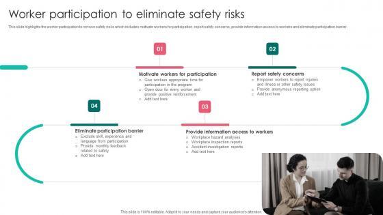 This slide highlights the worker participation to remove safety risks which includes motivate workers for participation, report safety concerns, provide information access to workers and eliminate participation barrier. Do you have to make sure that everyone on your team knows about any specific topic I yes, then you should give Worker Participation To Eliminate Safety Workplace Safety Protocol And Security Practices Icons Pdf a try. Our experts have put a lot of knowledge and effort into creating this impeccable Worker Participation To Eliminate Safety Workplace Safety Protocol And Security Practices Icons Pdf. You can use this template for your upcoming presentations, as the slides are perfect to represent even the tiniest detail. You can download these templates from the Slidegeeks website and these are easy to edit. So grab these today This slide highlights the worker participation to remove safety risks which includes motivate workers for participation, report safety concerns, provide information access to workers and eliminate participation barrier.