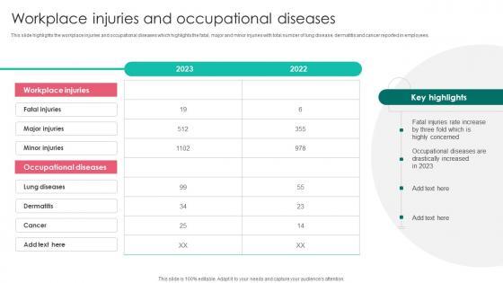 This slide highlights the workplace injuries and occupational diseases which highlights the fatal, major and minor injuries with total number of lung disease, dermatitis and cancer reported in employees. Get a simple yet stunning designed Workplace Injuries And Occupational Workplace Safety Protocol And Security Practices Download Pdf. It is the best one to establish the tone in your meetings. It is an excellent way to make your presentations highly effective. So, download this PPT today from Slidegeeks and see the positive impacts. Our easy to edit Workplace Injuries And Occupational Workplace Safety Protocol And Security Practices Download Pdf can be your go to option for all upcoming conferences and meetings. So, what are you waiting for Grab this template today. This slide highlights the workplace injuries and occupational diseases which highlights the fatal, major and minor injuries with total number of lung disease, dermatitis and cancer reported in employees.