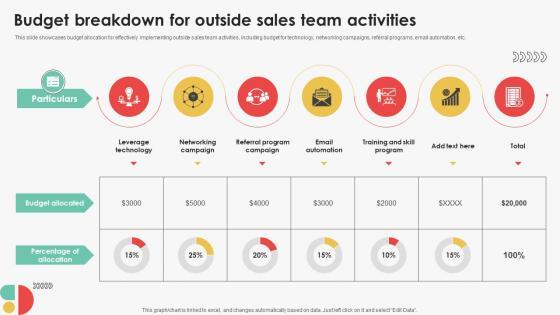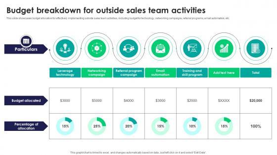 This slide showcases budget allocation for effectively implementing outside sales team activities, including budget for technology, networking campaigns, referral programs, email automation, etc. Do you have to make sure that everyone on your team knows about any specific topic I yes, then you should give Budget Breakdown For Outside Sales Team Activities Tactics For Improving Field Sales Team SA SS V a try. Our experts have put a lot of knowledge and effort into creating this impeccable Budget Breakdown For Outside Sales Team Activities Tactics For Improving Field Sales Team SA SS V. You can use this template for your upcoming presentations, as the slides are perfect to represent even the tiniest detail. You can download these templates from the Slidegeeks website and these are easy to edit. So grab these today This slide showcases budget allocation for effectively implementing outside sales team activities, including budget for technology, networking campaigns, referral programs, email automation, etc.