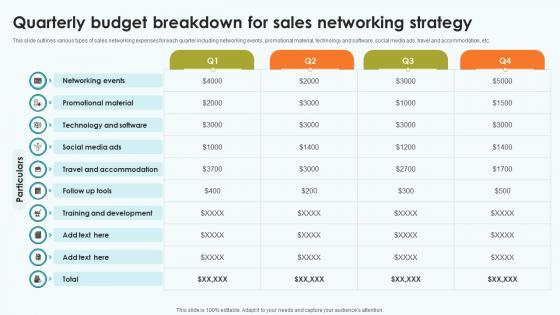 This slide outlines various types of sales networking expenses for each quarter including networking events, promotional material, technology and software, social media ads, travel and accommodation, etc. Want to ace your presentation in front of a live audience Our Elevating Sales Networks Quarterly Budget Breakdown For Sales Networking Strategy SA SS V can help you do that by engaging all the users towards you. Slidegeeks experts have put their efforts and expertise into creating these impeccable powerpoint presentations so that you can communicate your ideas clearly. Moreover, all the templates are customizable, and easy-to-edit and downloadable. Use these for both personal and commercial use. This slide outlines various types of sales networking expenses for each quarter including networking events, promotional material, technology and software, social media ads, travel and accommodation, etc.