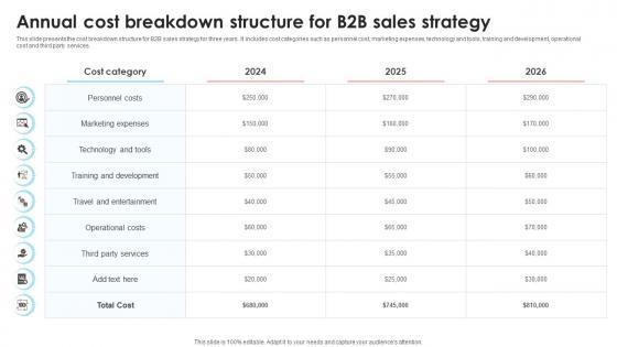 This slide presents the cost breakdown structure for B2B sales strategy for three years. It includes cost categories such as personnel cost, marketing expenses, technology and tools, training and development, operational cost and third party services. Get a simple yet stunning designed Navigating B2B Sales Annual Cost Breakdown Structure For B2B Sales Strategy SA SS V. It is the best one to establish the tone in your meetings. It is an excellent way to make your presentations highly effective. So, download this PPT today from Slidegeeks and see the positive impacts. Our easy-to-edit Navigating B2B Sales Annual Cost Breakdown Structure For B2B Sales Strategy SA SS V can be your go-to option for all upcoming conferences and meetings. So, what are you waiting for Grab this template today. This slide presents the cost breakdown structure for B2B sales strategy for three years. It includes cost categories such as personnel cost, marketing expenses, technology and tools, training and development, operational cost and third party services.