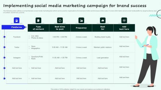 The following slide outlines a comprehensive social media marketing plan which can be used by organizations for brand promotion and increase online sales. It covers information about social media platforms, target audience, type of content, best time to post etc. Make sure to capture your audiences attention in your business displays with our gratis customizable Implementing Social Media Marketing Campaign Strategies For Enhancing Sales And Mockup Pdf. These are great for business strategies, office conferences, capital raising or task suggestions. If you desire to acquire more customers for your tech business and ensure they stay satisfied, create your own sales presentation with these plain slides. The following slide outlines a comprehensive social media marketing plan which can be used by organizations for brand promotion and increase online sales. It covers information about social media platforms, target audience, type of content, best time to post etc.