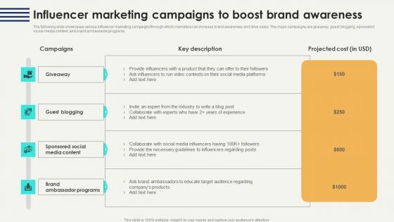 The following slide showcases various influencer marketing campaigns through which marketers can increase brand awareness and drive sales. The major campaigns are giveaway, guest blogging, sponsored social media content, and brand ambassador programs. This Influencer Marketing Campaigns Digital Marketing Strategies Improve Enterprise Sales Infographics Pdf from Slidegeeks makes it easy to present information on your topic with precision. It provides customization options, so you can make changes to the colors, design, graphics, or any other component to create a unique layout. It is also available for immediate download, so you can begin using it right away. Slidegeeks has done good research to ensure that you have everything you need to make your presentation stand out. Make a name out there for a brilliant performance. The following slide showcases various influencer marketing campaigns through which marketers can increase brand awareness and drive sales. The major campaigns are giveaway, guest blogging, sponsored social media content, and brand ambassador programs.